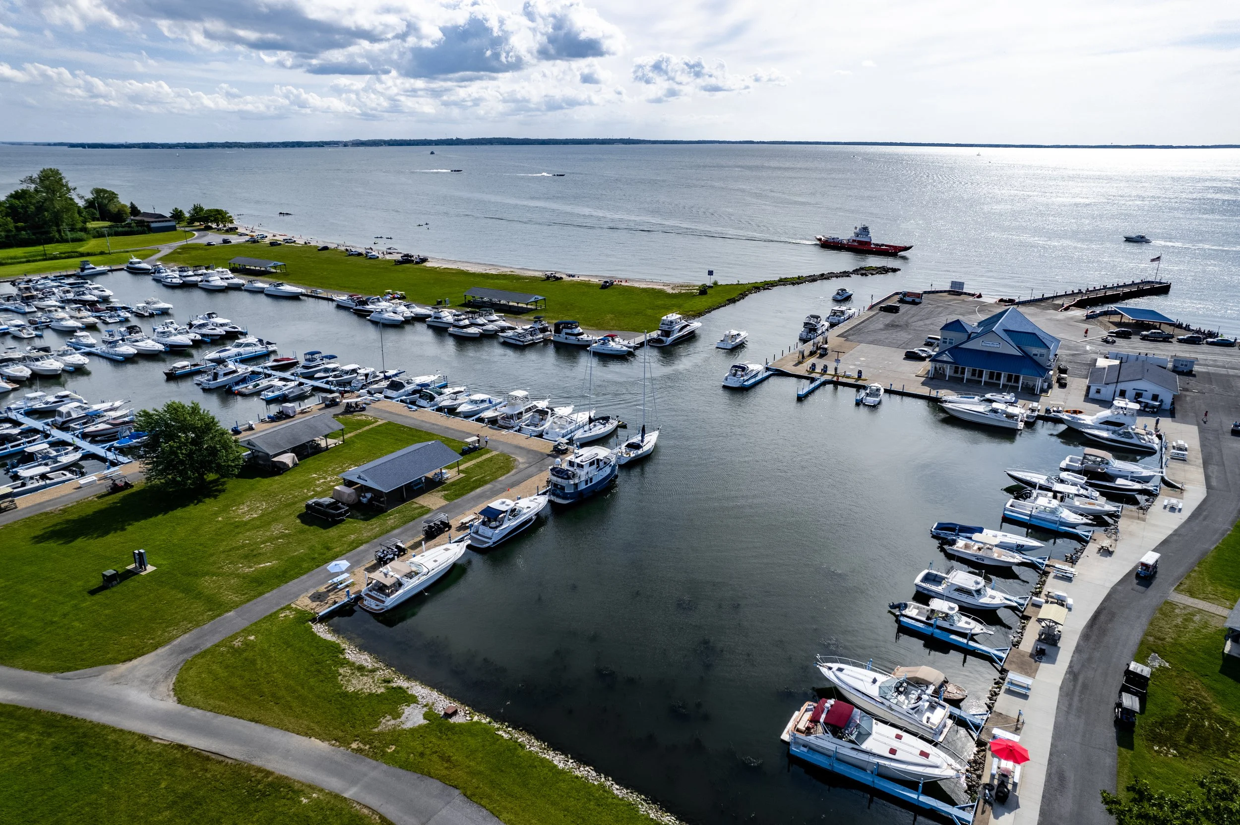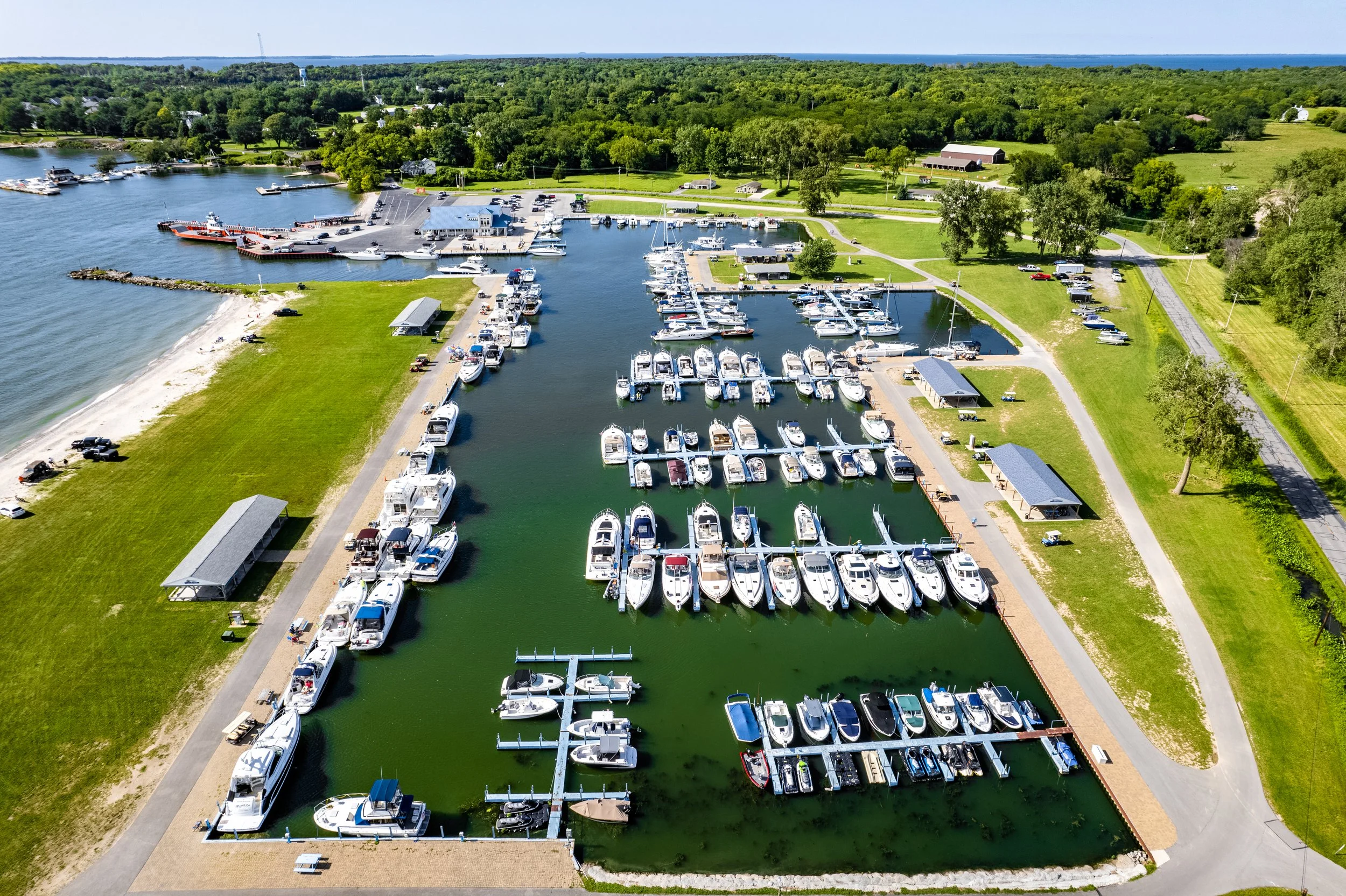 Whether you arrive by boat or step off the on-site ferry, you’ll find a safe, protected harbor, the island’s only fuel and pump-out station, and amenities that make settling in effortless. Spend your days exploring Lake Erie, gathering with friends under our pavilions or on the lawn, grabbing a bite at the café, cruising the island by golf cart, or simply relaxing on the beach and watching boats roll in.